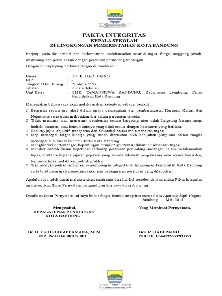 Contoh Pakta Integritas Adalah : Pakta Integritas Petugas Ruang Ujian Akh : Ditulis ahmad al faridzi kamis, 05 maret 2020.. Surat ini biasanya dipergunakan ketika ingin melamar atau mendaftar kerja atau jabatan baik di pemerinahan maupun swasta. Dalam rangka pelaksanaan ujian nasional, ujian sekolah dan unjan sekolah berstandar nasional tahun pelajaran 2016/2017 pada nama sekolah/madrasah kabupaten. Contoh pakta integritas dapat dilihat pada link tersebut. Karena saya pekerja jasa konsultasi dan kepengurusan sertifikasi dirjen sdppi, maka untuk contoh yang pertama saya berikan adalah draft pakta integritas untuk perusahaan. Diluar gaji bulanannya tersebut adalah suatu penerimaan yang tidak sah,